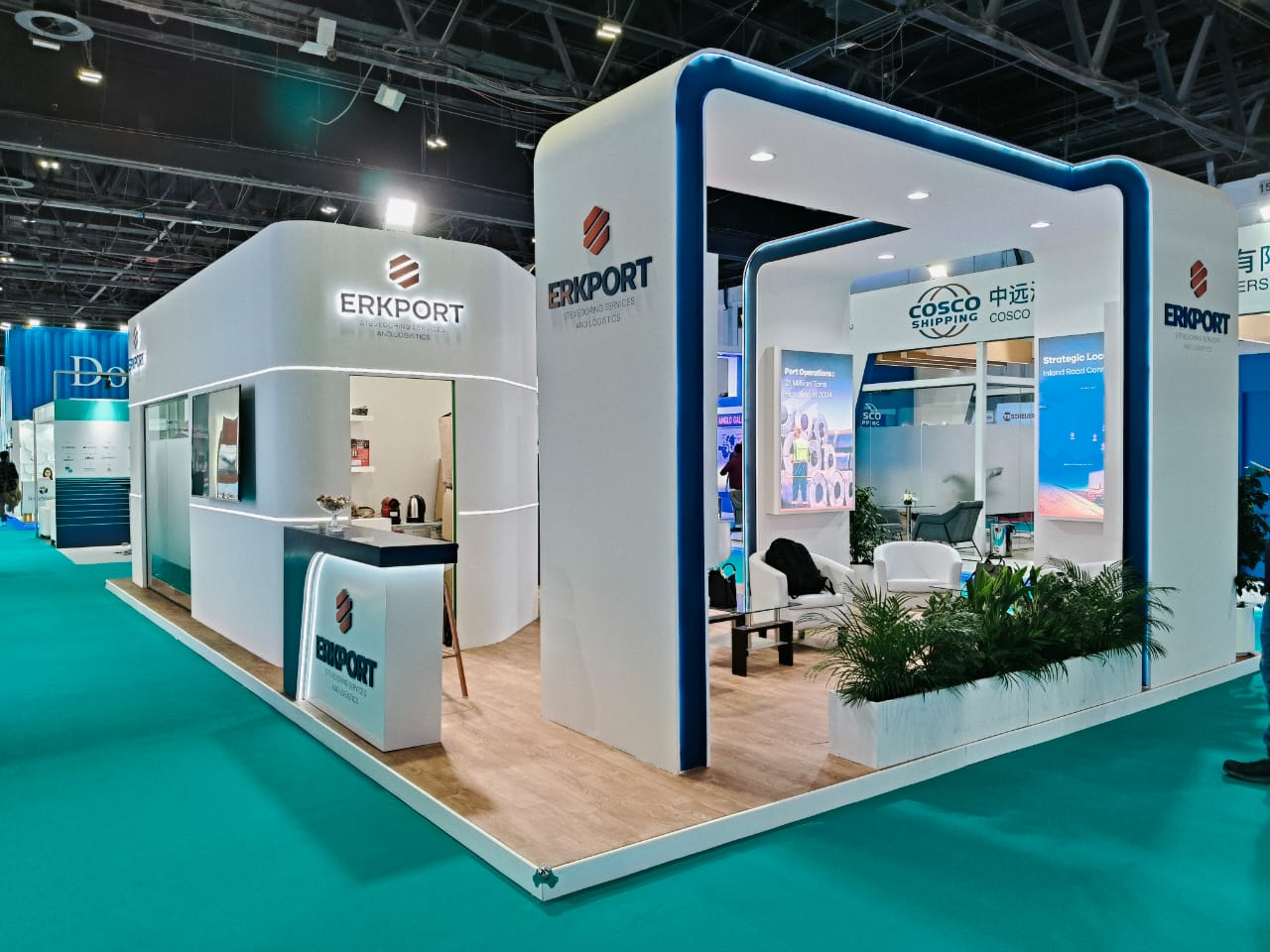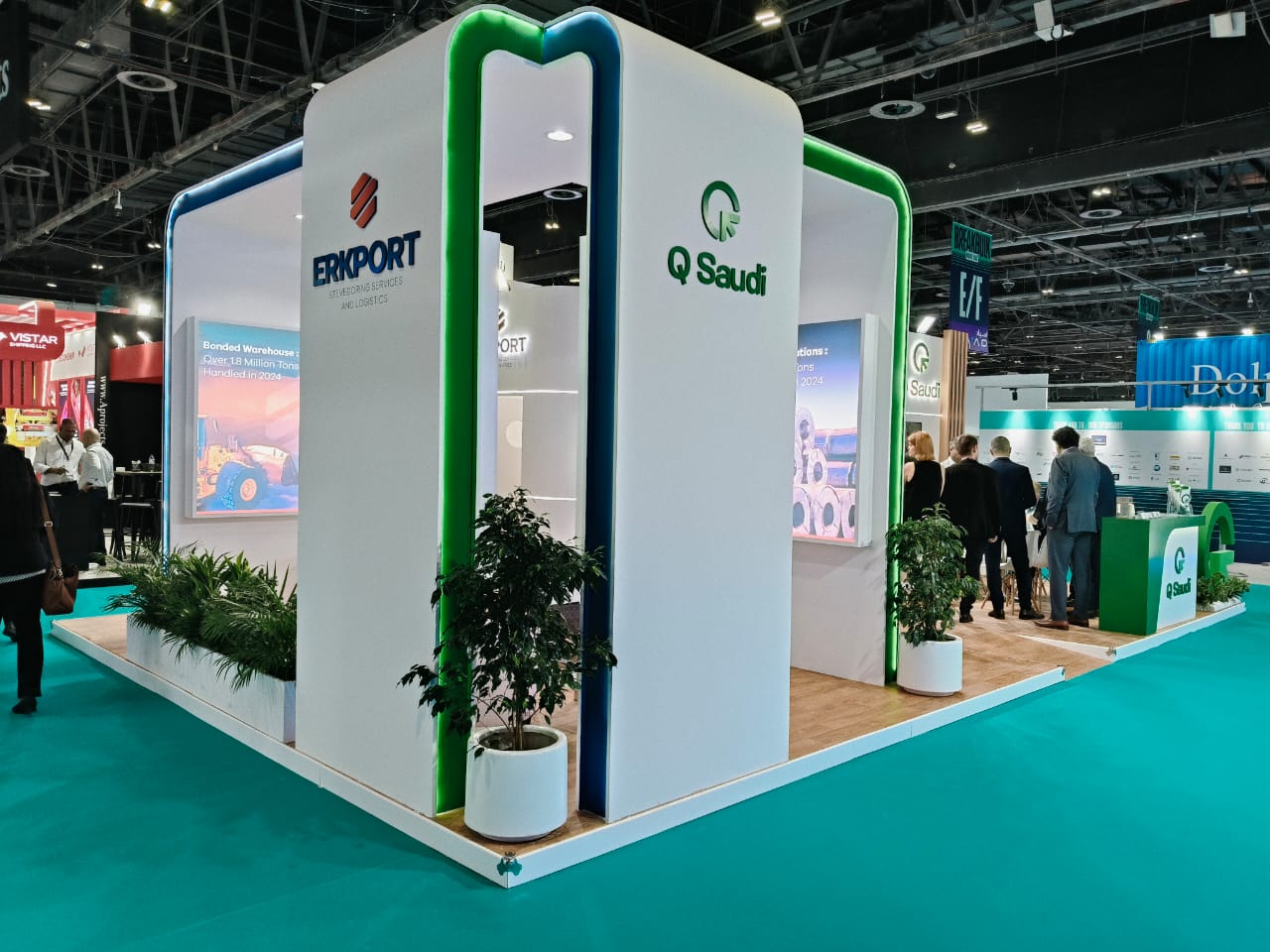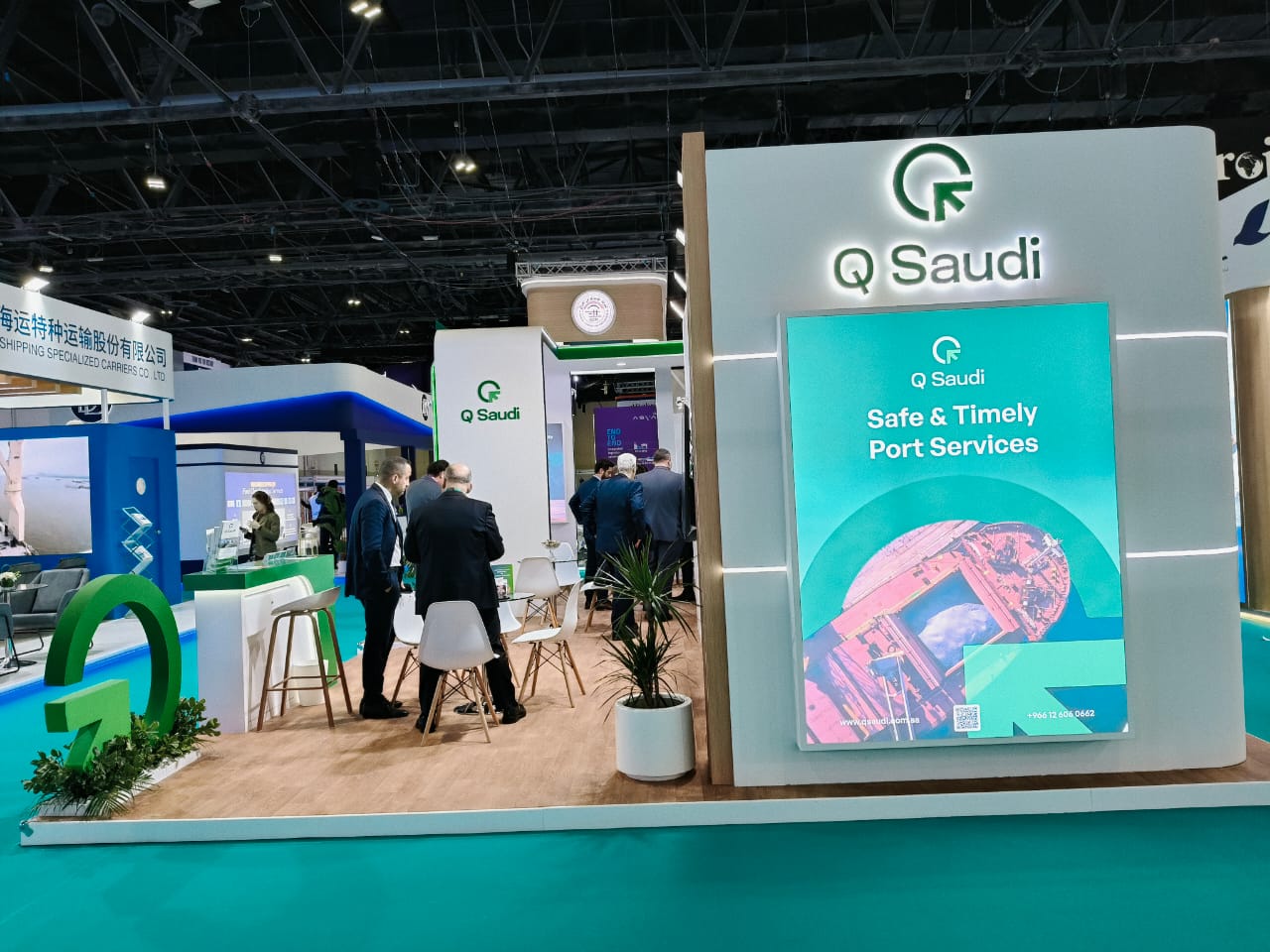 The booth combined a clean architectural design with open spaces to welcome industry professionals. Its structure was accentuated with LED framing and branded panels that enhanced QSaudi’s corporate visibility. Large screens were integrated to display digital content, while meeting areas created functional zones for business negotiations. This custom trade show booth in Dubai effectively communicated QSaudi’s role in logistics and stevedoring, highlighting its expertise to international visitors.